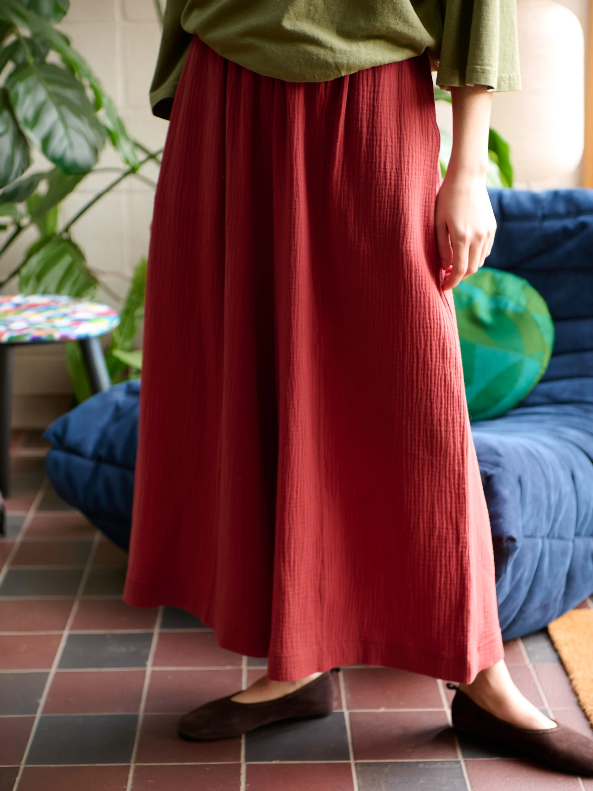 A softer take on our Rokko poplin trouser, this version is cut from ultra-soft cotton gauze that naturally crinkles for a relaxed, lived-in feel. It keeps the same cropped wide leg and comfortable elasticated waistband, but the lighter fabric gives it a gentle drape that moves with you. Finished with two deep front pockets for everyday ease.