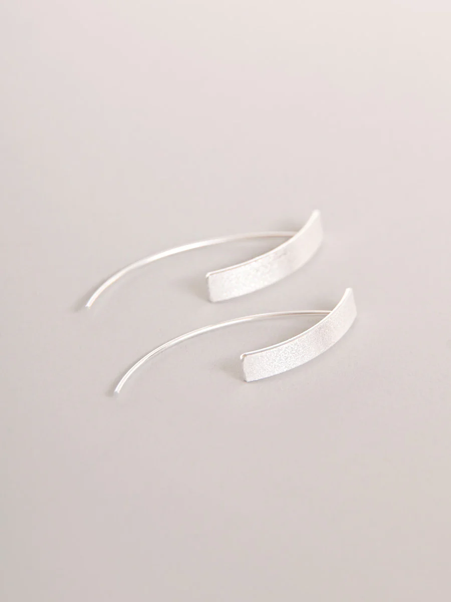 Handcrafted in 925 sterling silver with a matt finish, these thread through curved bar earrings present a modern minimalist aesthetic. Simple and elegant, ideal for everyday wearing.