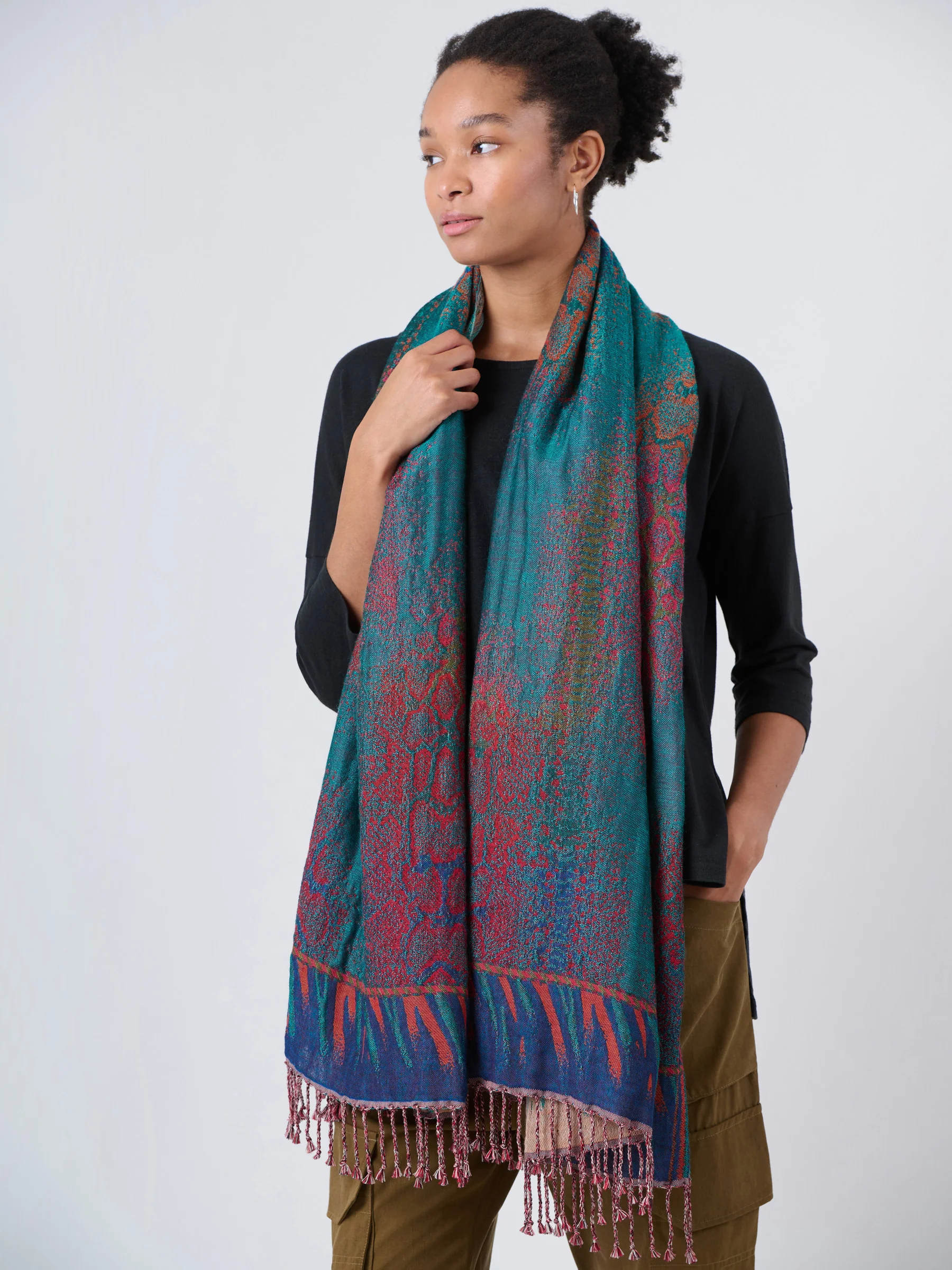 Made with a 100% natural wool cotton blend yarn, this Jacquard scarf with intricate pattern and vibrant colour will add a splash of energy to a dark wintery outfit. This scarf is slightly narrower than Wool Blend Blanket Scarf and Fine Wool Crinkle Textured Wrap Scarf