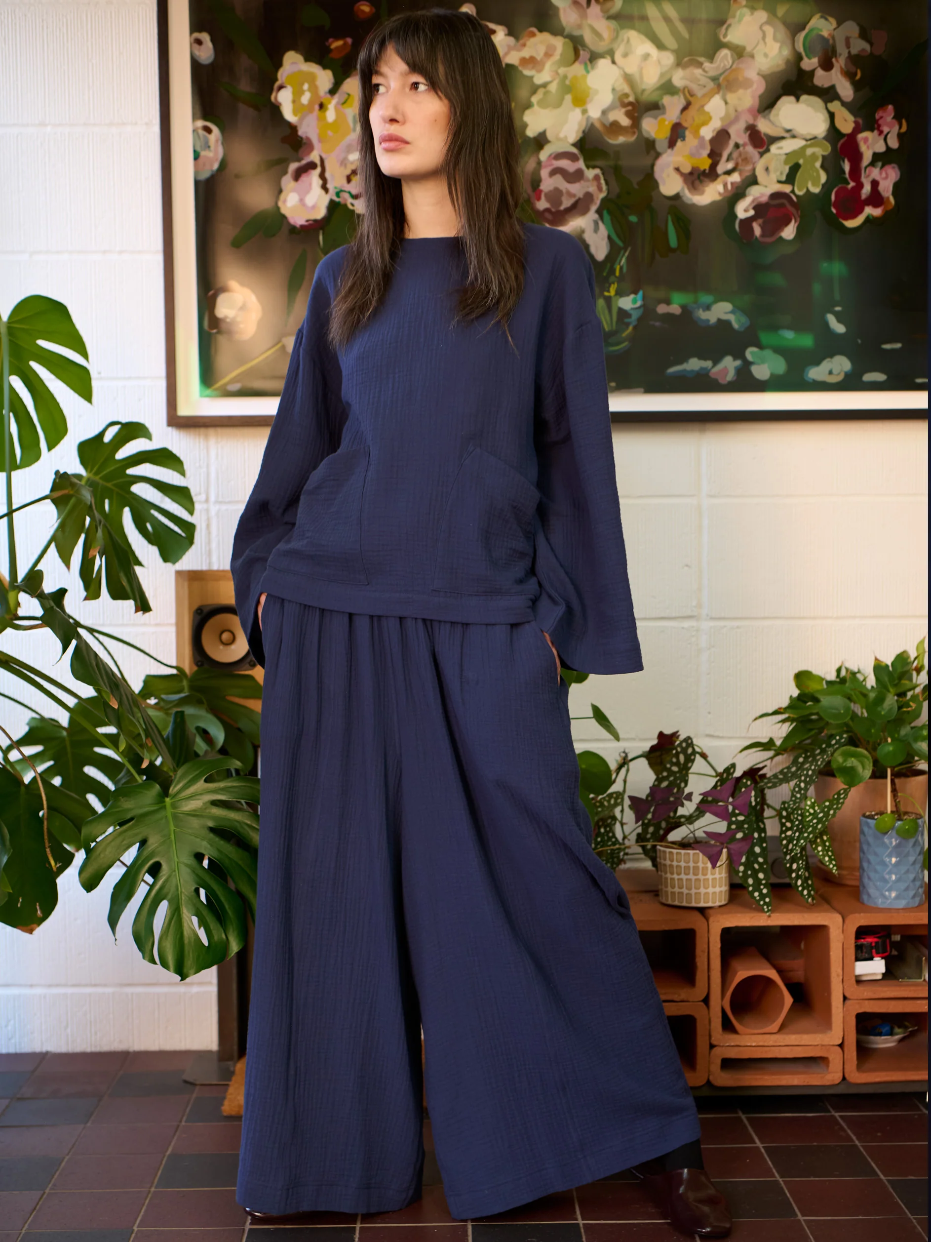 Cut from ultra-soft cotton gauze with a natural crinkle, the Zandora top has an easy A-line shape and two generous front pockets for both function and detail. Turn it around to see the back yoke, finished with soft gathers for a little movement. At the neckline, it fastens with a natural mother-of-pearl button.